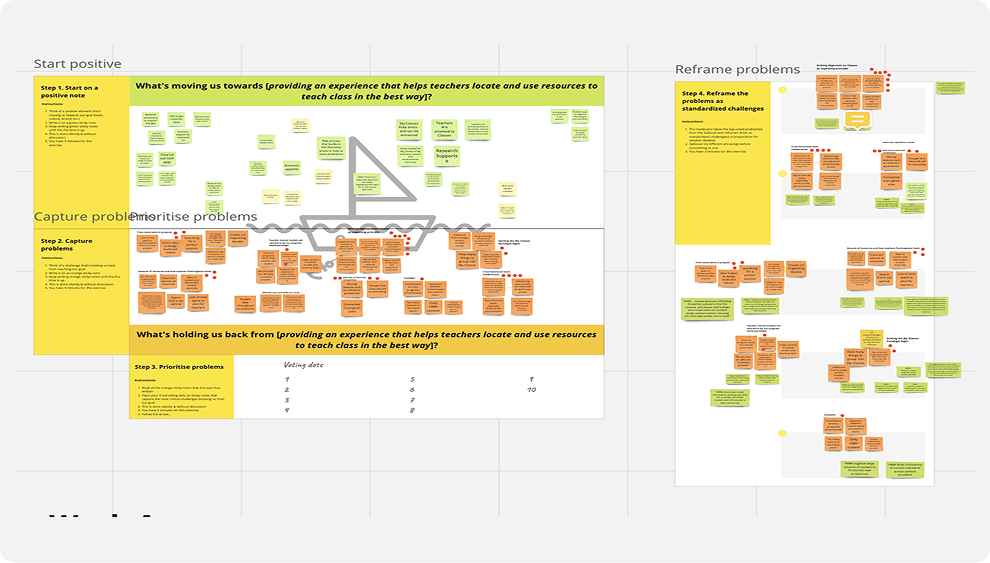 Screenshots of Miro boards where I hosted design thinking workshops to strategize design solutionsPantallazos de los tableros Miro donde organicé talleres de design thinking para estrategizar soluciones de diseño