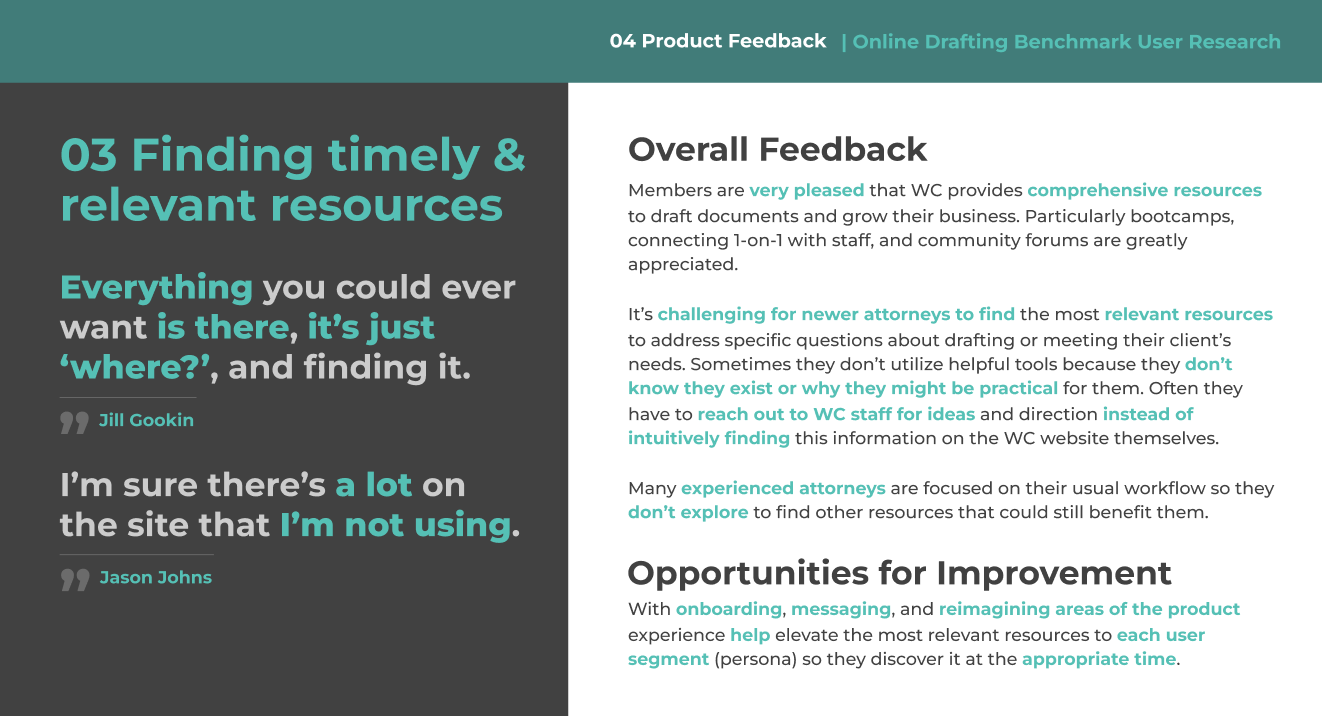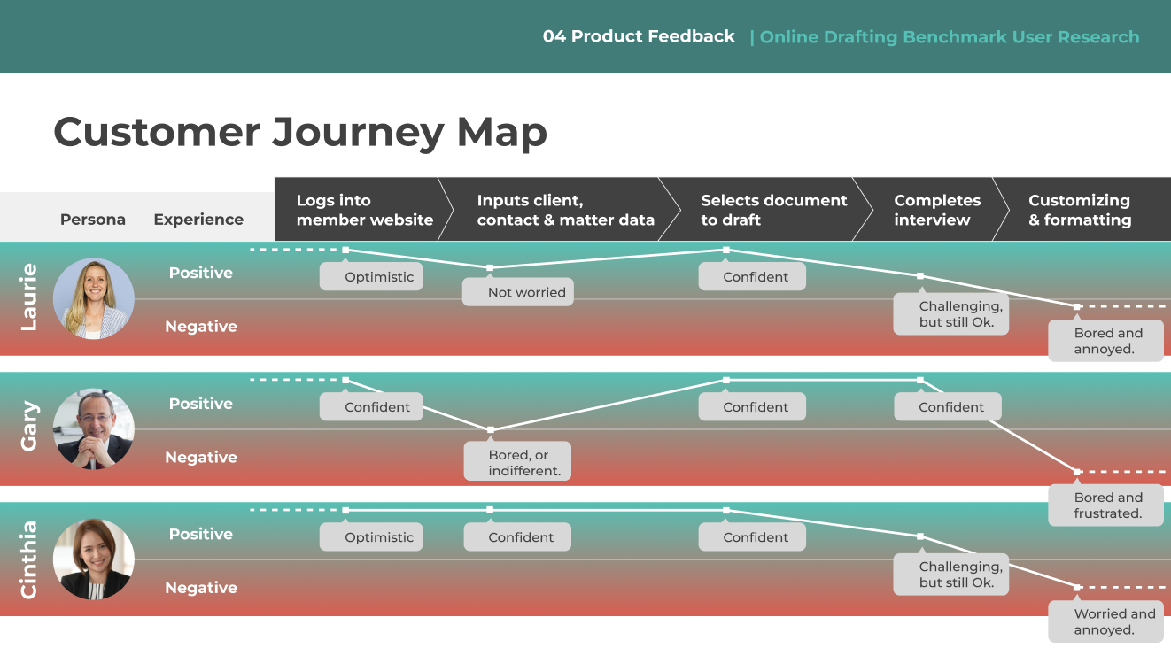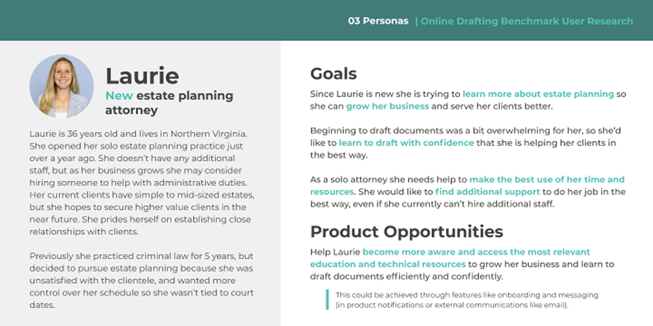 To better understand our users, I initiated and led a benchmark product research study. I conducted 22 in-depth interviews with attorneys across different practice sizes and experience levels.Para comprender mejor a nuestros usuarios, inicié y lideré un estudio de investigación comparativa de productos. Realicé 22 entrevistas en profundidad con abogados de diferentes tamaños de práctica y niveles de experiencia.