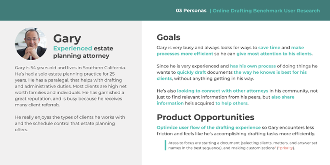 User personas developed from research interviews showing different attorney profiles and needsPersonas de usuario desarrolladas a partir de entrevistas de investigación mostrando diferentes perfiles y necesidades de abogados